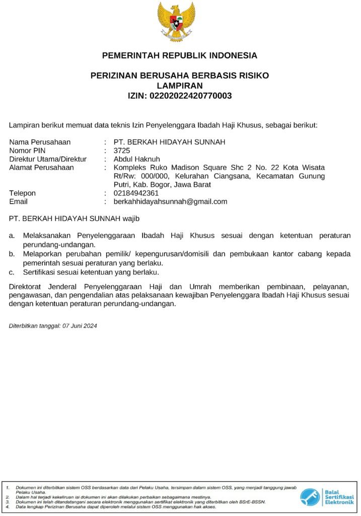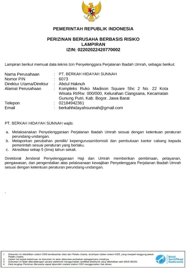 Legalitas PT Berkah Hidayah Sunnah