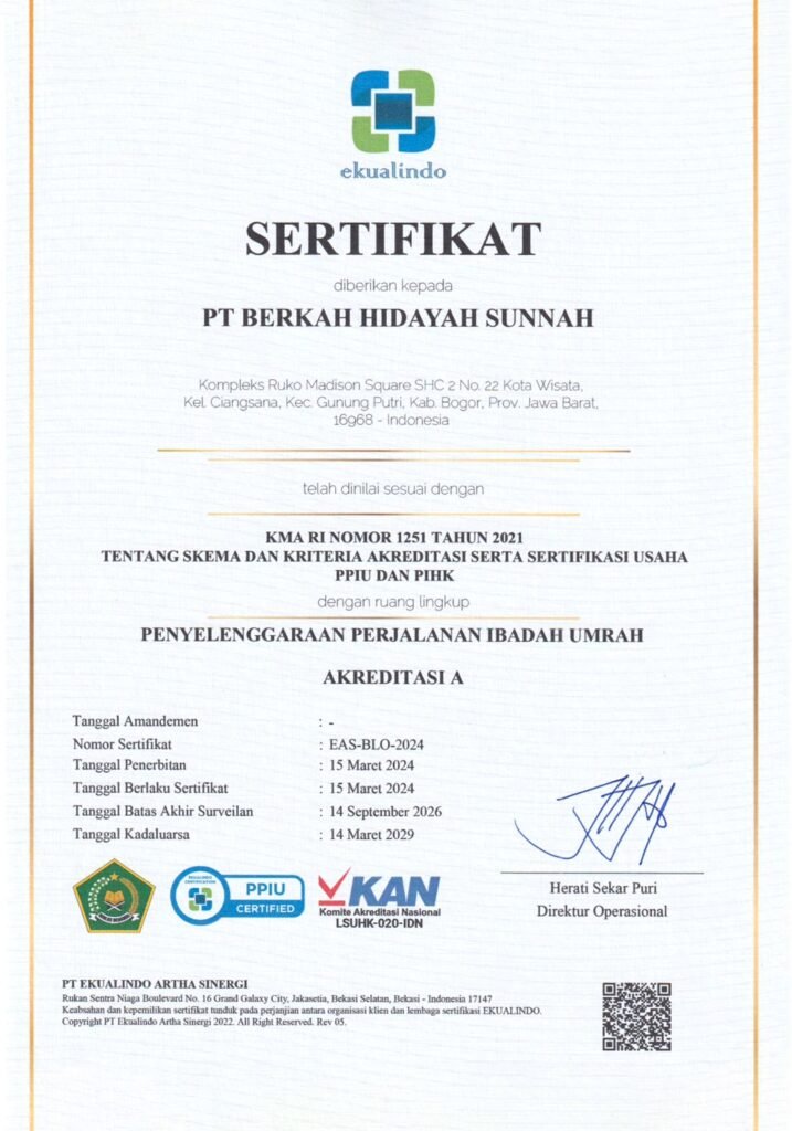 Setelah masa pandemi berakhir, Sunnah Travel kembali melangkah dengan lebih serius dan profesional. Pada tahun berikutnya, izin resmi sebagai Penyelenggara Perjalanan Ibadah Umrah (PPIU) diperoleh dengan nama badan hukum PT. Berkah Hidayah Sunnah, dan di tahun 2024, kami pun mendapat kepercayaan dari Kementerian Agama RI sebagai Penyelenggara Ibadah Haji Khusus (PIHK).